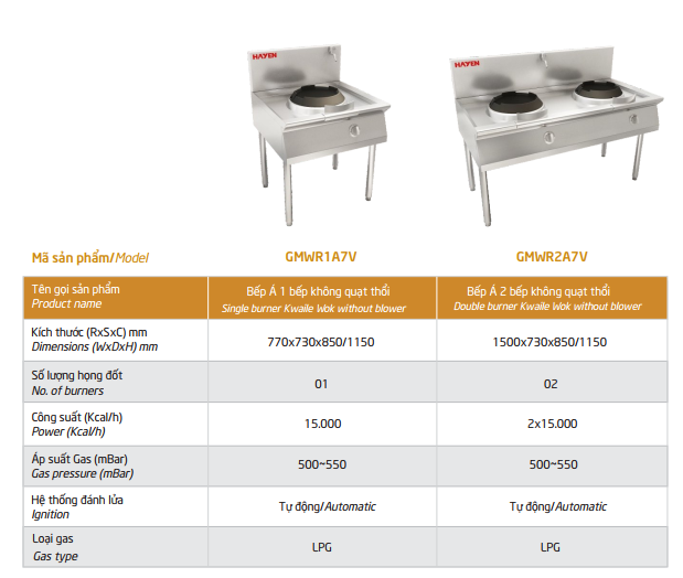 THÔNG SỐ KỸ THUẬT CỦA CÁC THIẾT BỊ BẾP Á KHÔNG QUẠT THỔI: